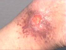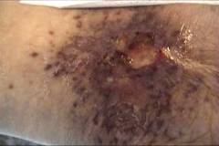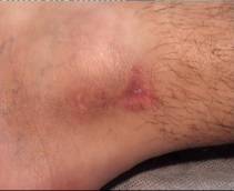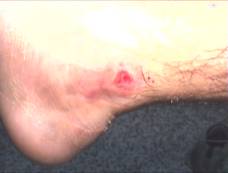 S.V. 21 años. Estudiante Ulcera residual que no cura tras un accidente en moto que provocó herida inciso-contusa en maleolo interno, interesando a éste, pero solo con erosión. El pie presento gran hichazon y hematoma. El cirujano le refresca la herida (técnica de Friederich). Toma durante 20 dias antibióticos y analgésicos, llegando a mi como lo presenta en la foto 1. Tras dos sesiones de Tratamiento local: Limpieza de la úlcera con agua hervida con Sal, retirando bien los esfacelos. Infiltración periferica (3-5 cm del borde de la ulcera) con suero (10 cc)+Lidocaina (1 ampolla). Infiltración posterior de Ozono/oxigeno a 12 microgramos /mililitro. Aspiración con la campana conectado a una bomba de vacio Aplicación de Ozono/Oxigeno a 100 microgramos /mililitro, en bolsa de plastico durante 15 minutos Resultado: Como se ve en la foto 2 se ve el cierre de la herida quedándose la minima reaccion cicatricial; no obstante, al volver a trabajar (es camarero), se le hincha el tobillo, debido a la destrucción de livaticos retromaleolares, por lo que se le aplico dos sesiones mas con Ozono local con el fin de ablandar la cicatriz. Actualmente ya no se le hincha
